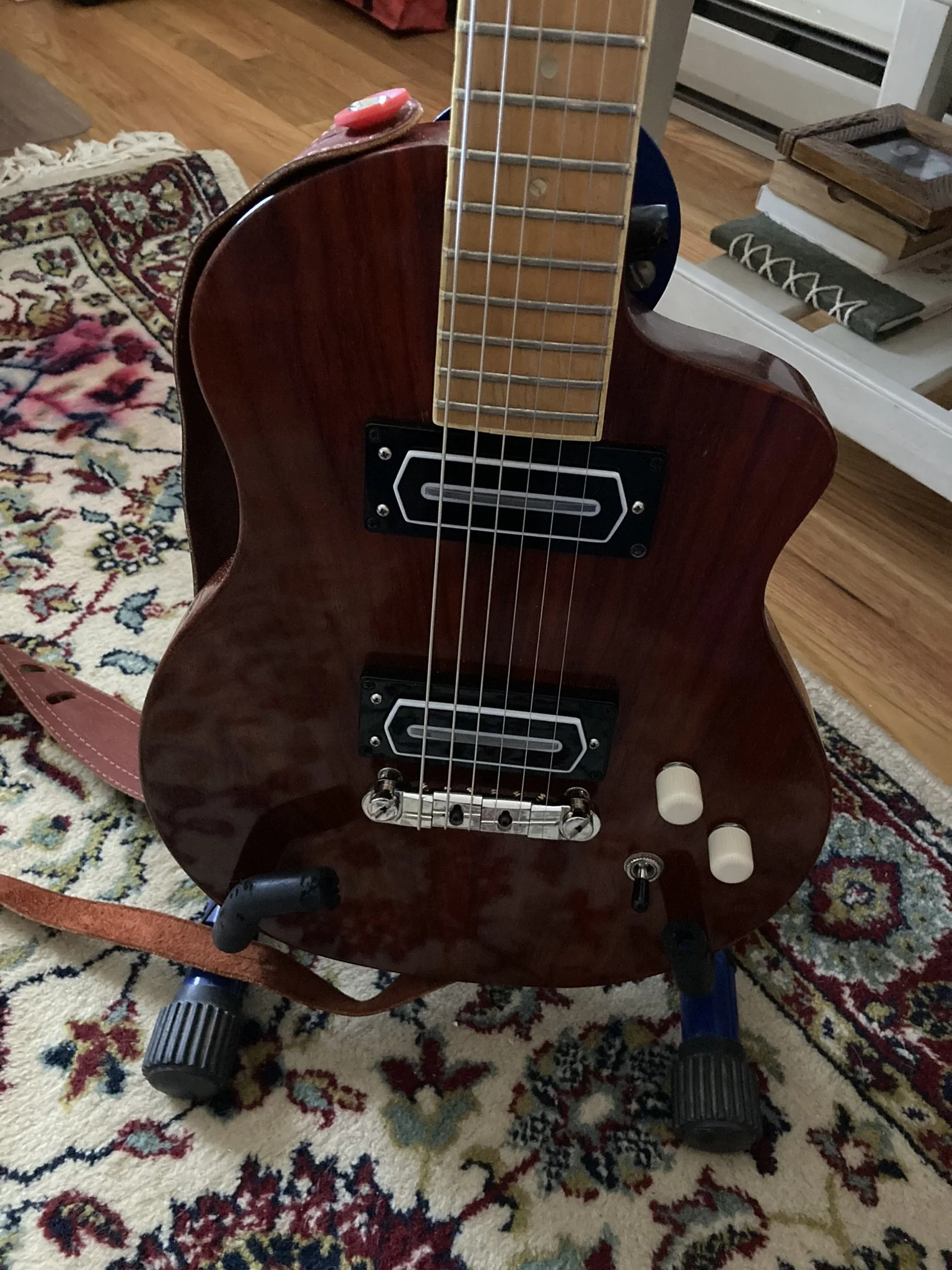 The body, which is made of African Padauk, weighed a ton. After much deliberation, I decided to cut it down to a smaller size to decrease the weight. I wanted to make a really simple, clean guitar: 2 pickups, volume, tone and a pickup selector switch. I put Charlie Christian style pickups in it, because I had never used these type of pickups before. The old recordings of Charlie Christian on record feature a guitar sound so raw and primal and flat out great that I just had to check it out for myself! The neck is a bit of a salvage piece: it’s a Gibson neck off an obscure late 70’s model called the RD Series (w/ electronics by Bob Moog!). The guitar body was long gone — all I got was the neck. And it’s a Gibson alright, but with a more Fender-style 25.5” scale length and a maple fingerboard! Definitely unusual!