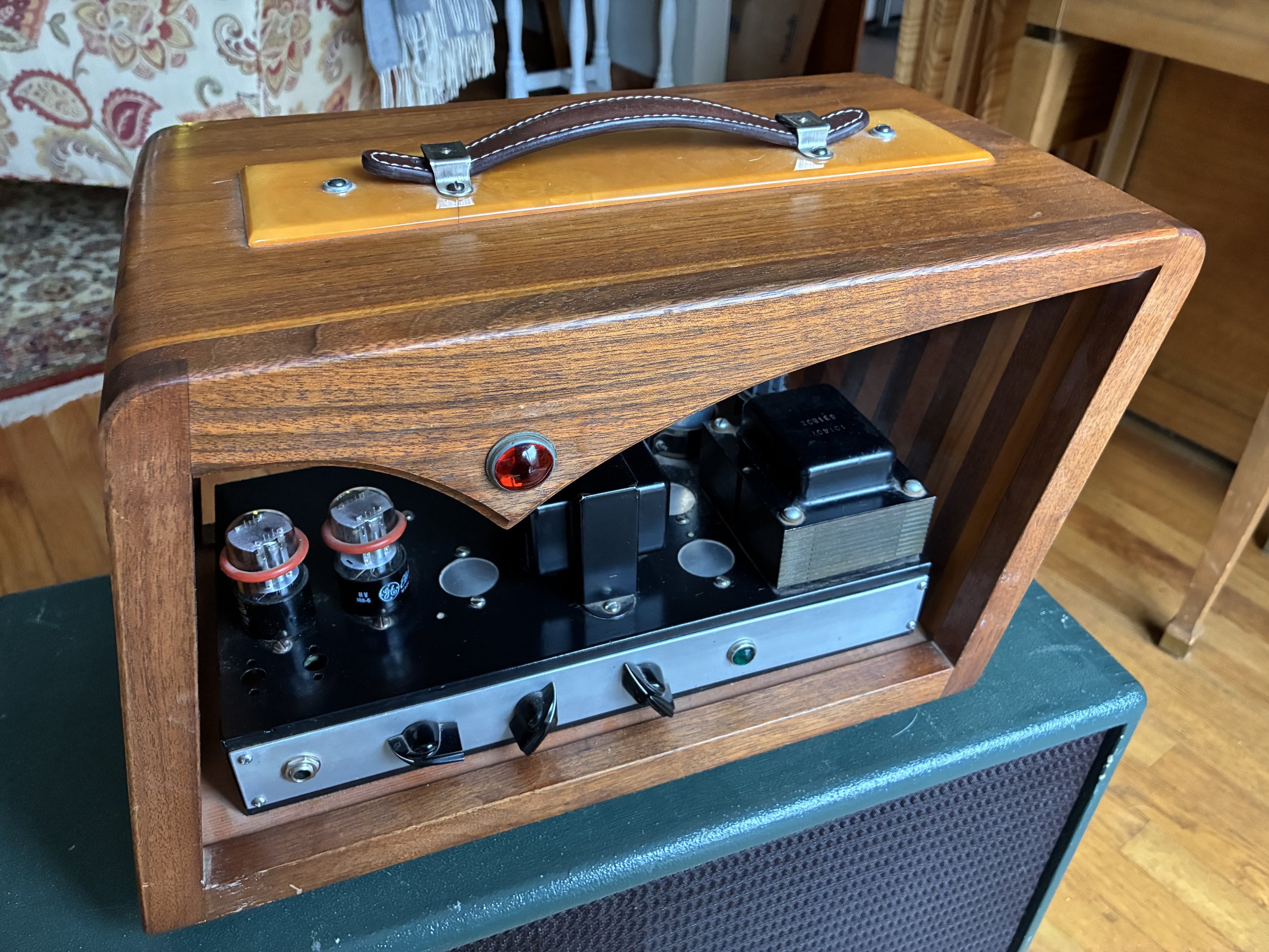 Handbuilt 2x6V6 amplifier. Tweed/blackface hybrid circuit. Tube rectifier, octal preamp tubes. Custom design hardwood cabinet made by Santa Fe artist James Holmes. $1000.00